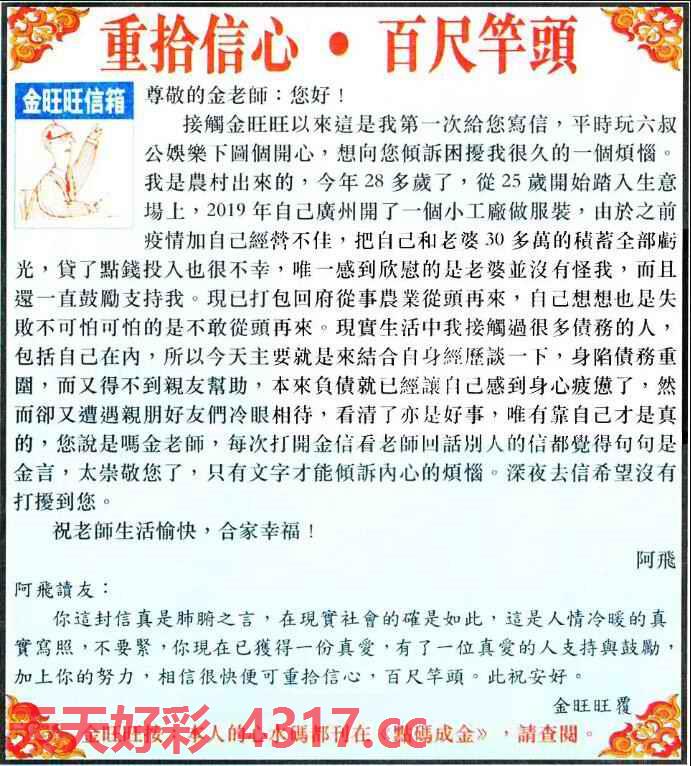 088期:金旺旺信箱彩民推荐→→《重拾信心·百尺竿頭》